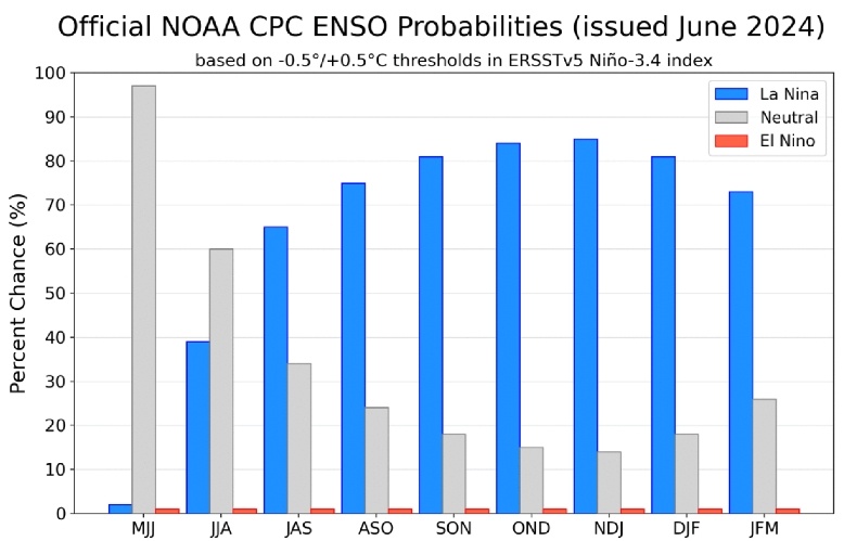 Eventos mais fortes aumentam a probabilidade de impactos típicos em áreas propensas, mas não necessariamente resultam em impactos mais fortes. Mesmo uma La Niña moderada ou fraca pode ter um grande impacto em determinadas regiões. Já sabemos que há uma alta probabilidade (85%) de que a La Niña se estabeleça no verão de 2024/25.