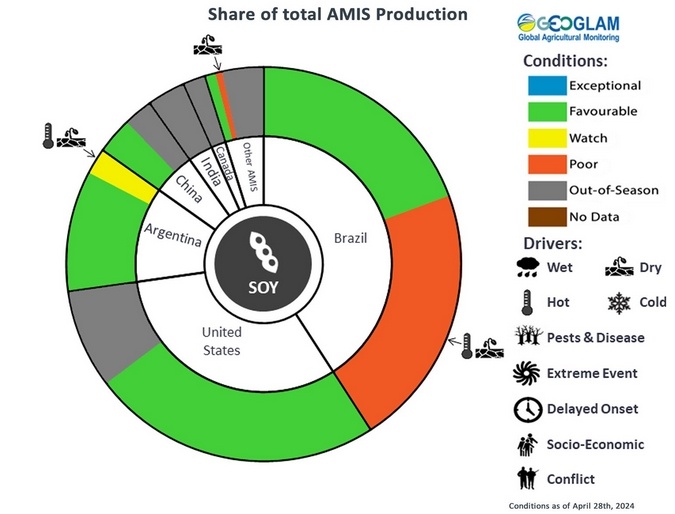 Representação gráfica das condições da soja nos principais produtores do mundo. Fonte: GEOGLAM.
