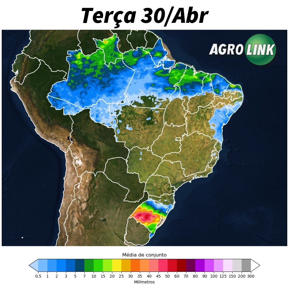 Segue a condição de chuvas extremas sobre o sul da região enquanto a metade norte tem o predomínio de tempo firme no decorrer do dia. A atuação das instabilidades sobre o Rio Grande do Sul, volumosas, marcaram uma sequência de chuvas intensas sobre o estado. Essas instabilidades serão acompanhadas de condições de tempo adverso com possibilidade de queda de granizo grande e vendavais. Os maiores acumulados podem ocorrer na grande região de Santa Maria na parcela central do Rio Grande do Sul, com valor que se aproxima dos 100 mm no decorrer do período.